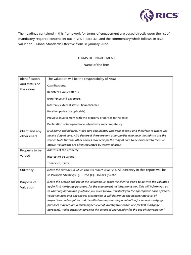 Terms of Engagement Framework PDF Real Estate Appraisal Market Value