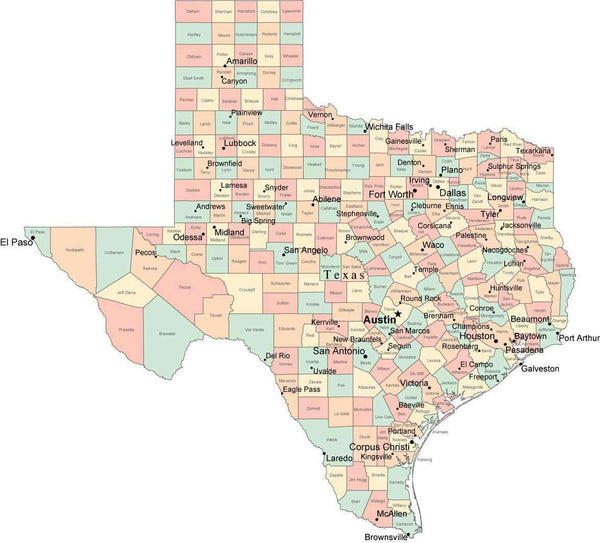 Multi Color Texas Map with Counties Capitals and Major Cities