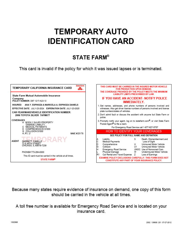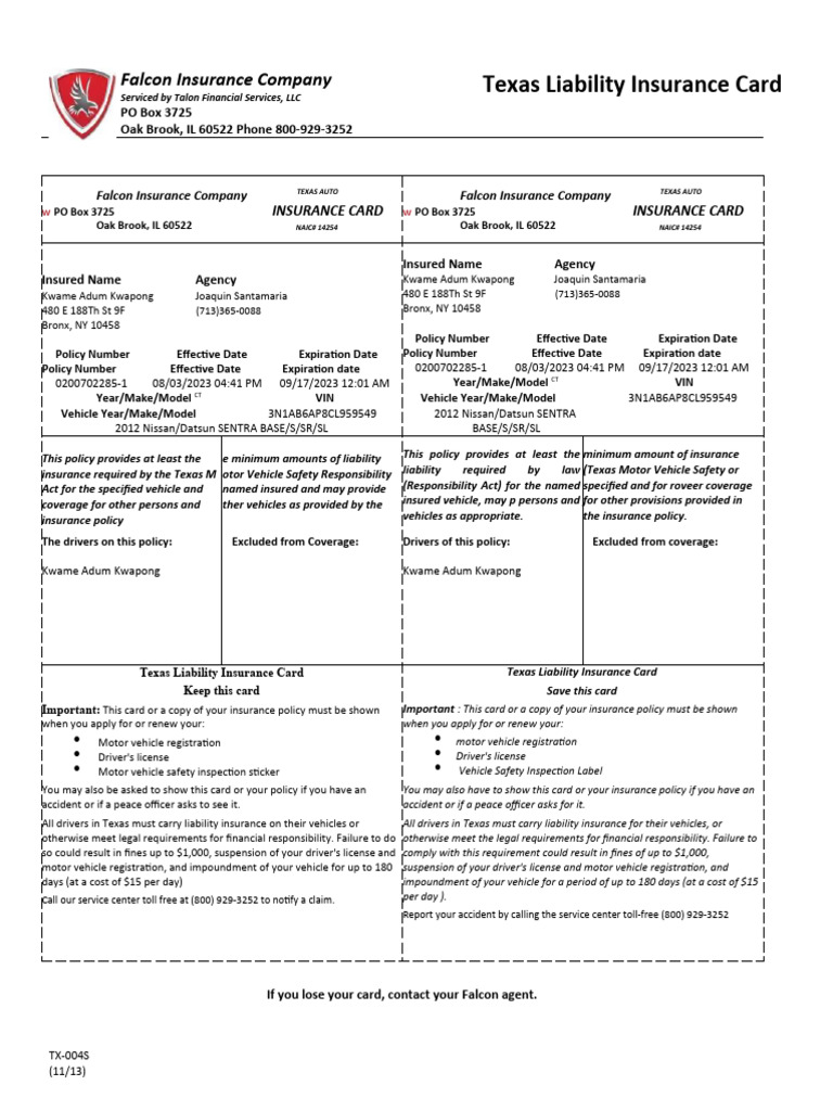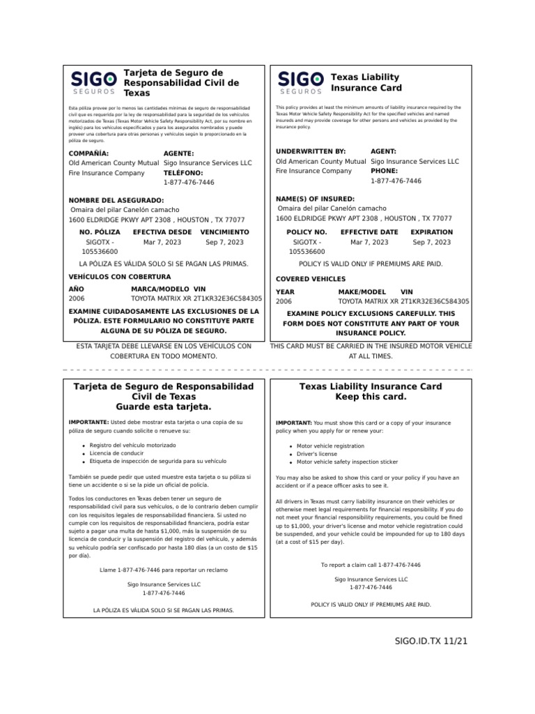 Texas Liability Insurance Card Tarjeta de Seguro de Responsabilidad