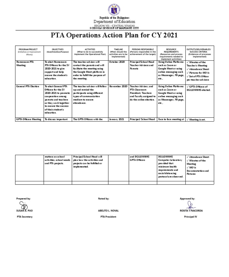 PTA Operations Action Plan For CY 2021: Department of Education