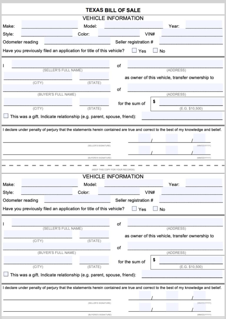Texas Vehicle Bill Of Sale Template