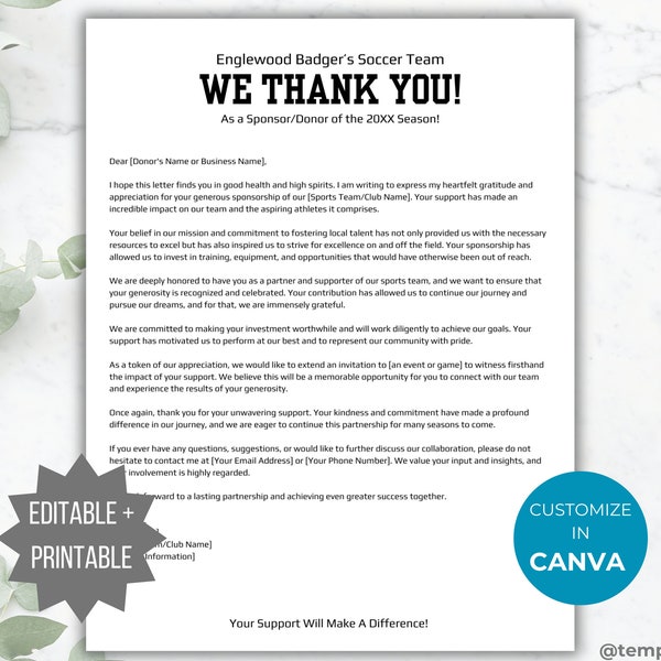 SPONSOR THANK YOU Letter Canva Template Event Sponsor Corporate