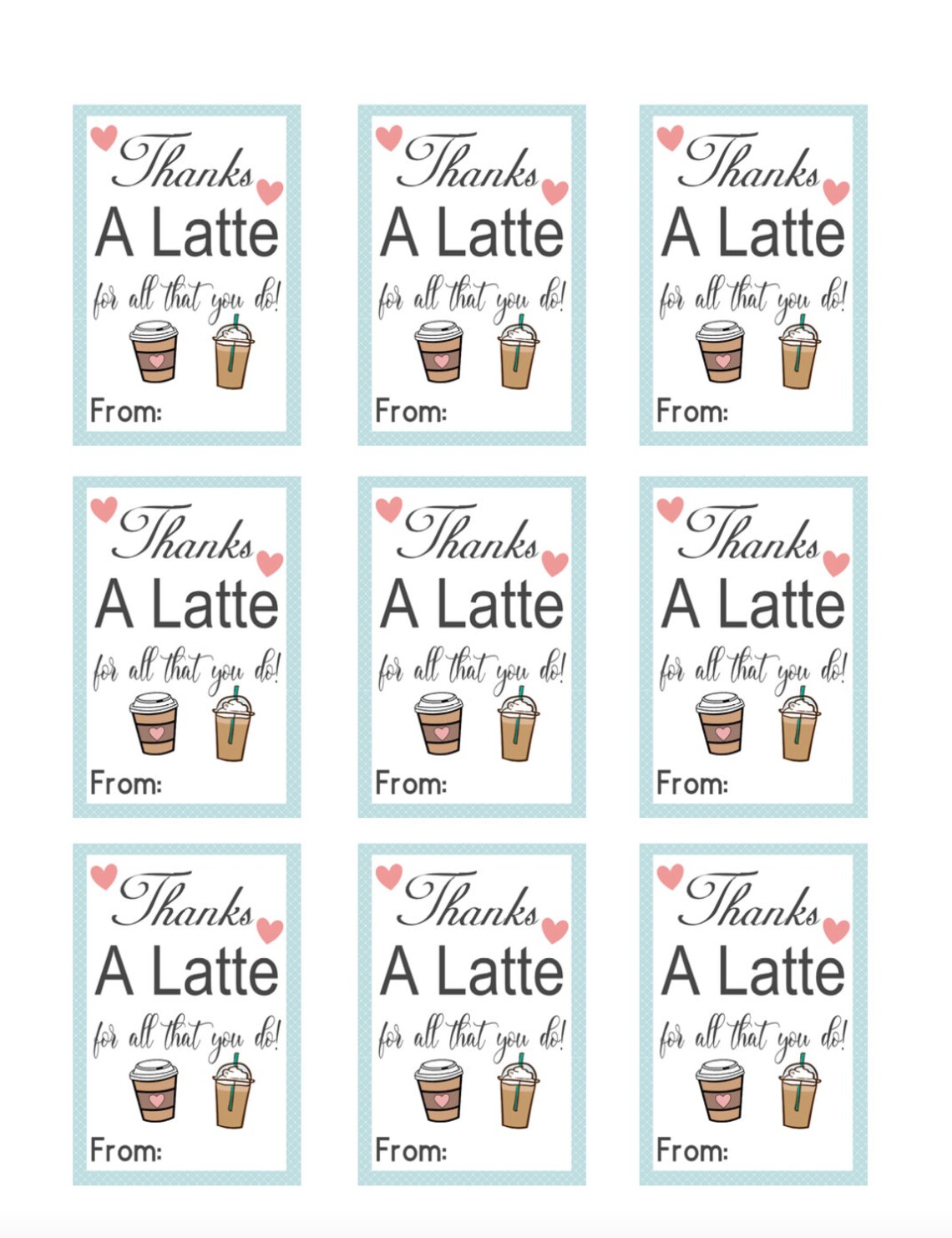 Printable Thanks A Latte Teacher Appreciation Week Coffee Gift Tags