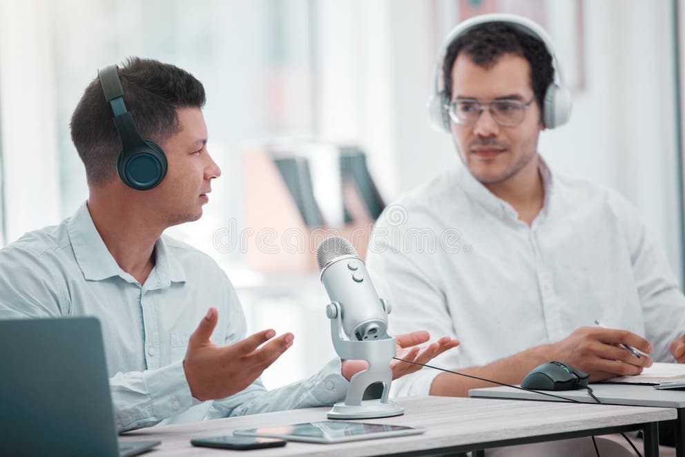 Thats a Valid Point two Young Men Doing a Broadcast in an Office