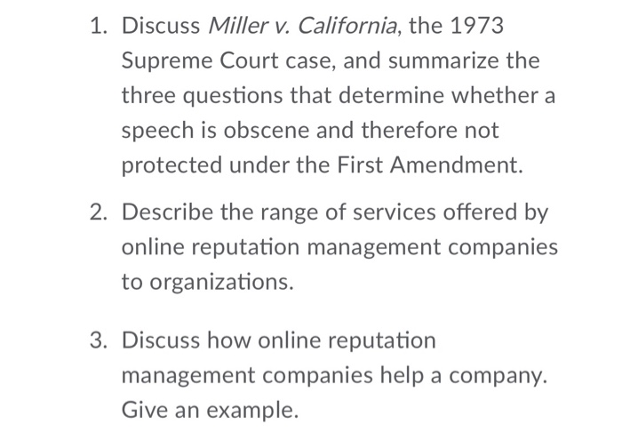Solved 1 Discuss Miller v California the 1973 Supreme Chegg com