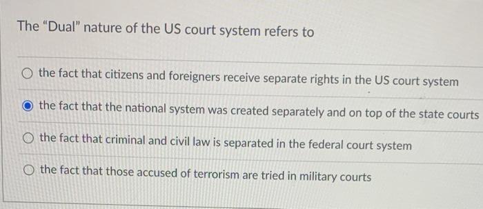 Solved The quot Dual quot nature of the US court system refers to o Chegg com