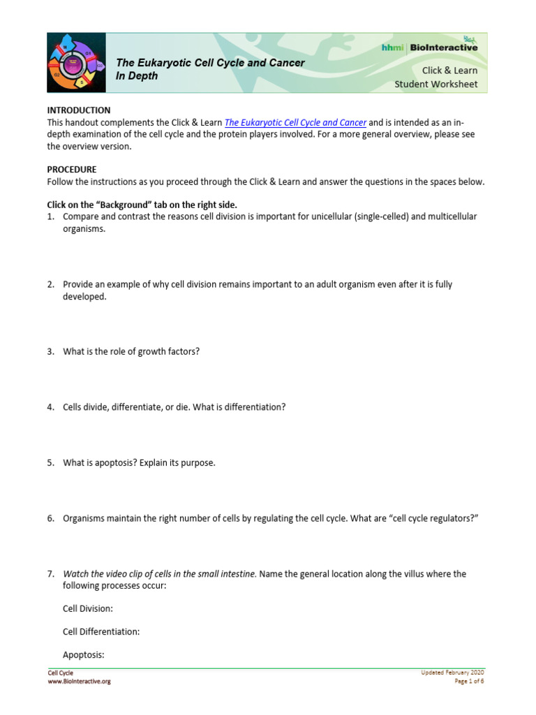 The Eukaryotic Cell Cycle and Cancer In Depth Student Worksheet Click