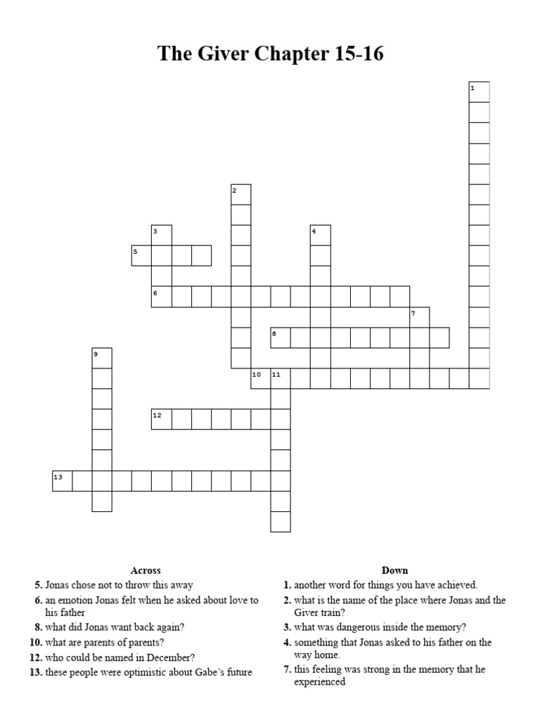 The Giver Crossword Chapters 9 12 Crossword Puzzle