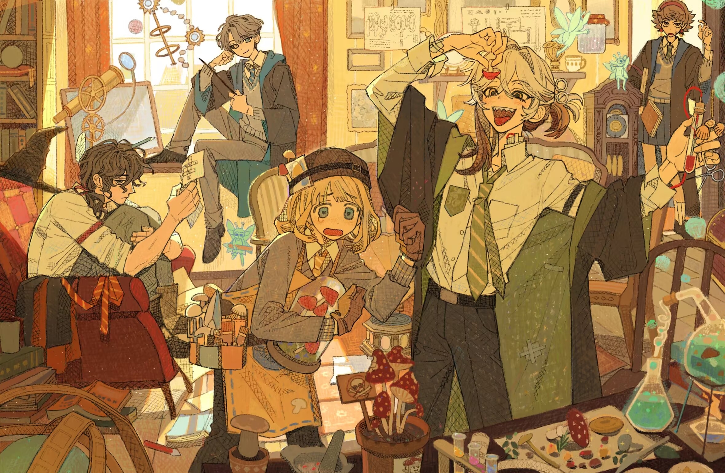 Safebooru 1girl 1other 3boys :d alcohol burner apron arm up bell jar