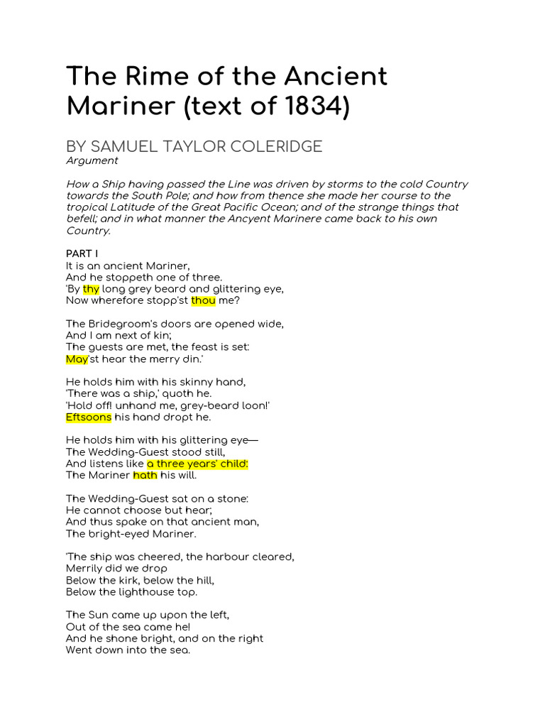 S T Coleridge The Rime of the Ancient Mariner Poem and Questions