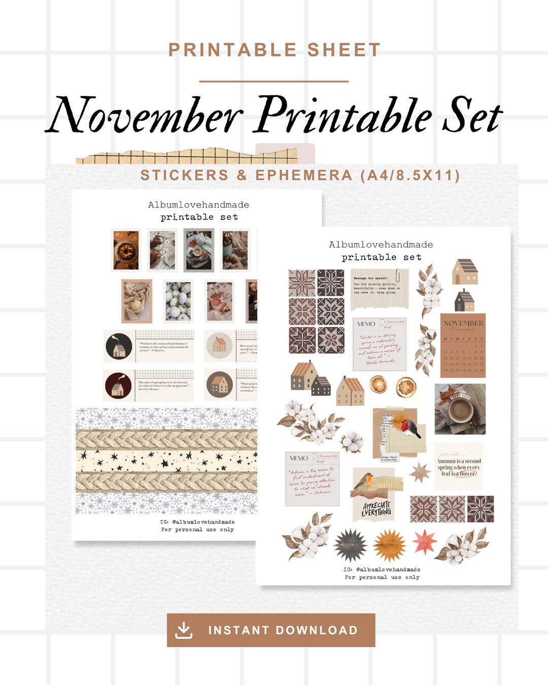 November Printable Paper Ephemera Stickers (a4/8 5x11) (digital