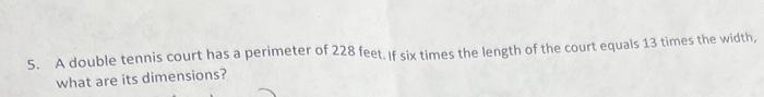 Solved 5 A double tennis court has a perimeter of 228 feet Chegg com
