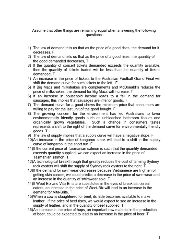 DemandSupply TrueFalse (With Answers) 20 Sentences PDF Demand