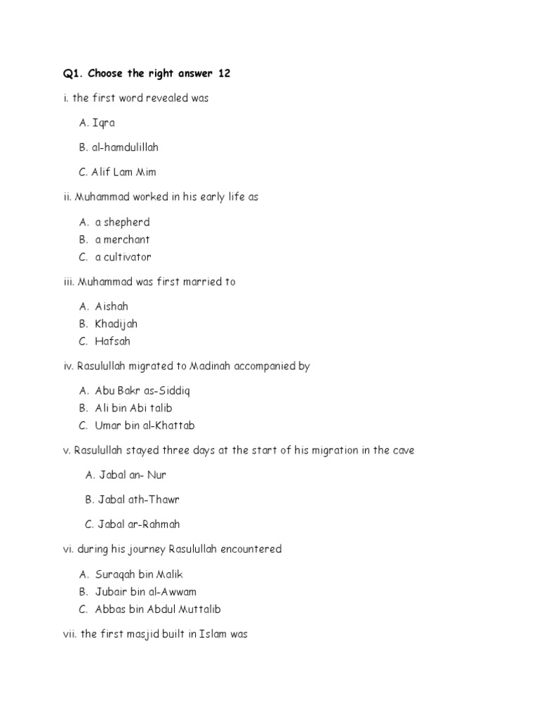 Islamic Education Worksheet MCQ and Truefalse PDF Medina Muhammad