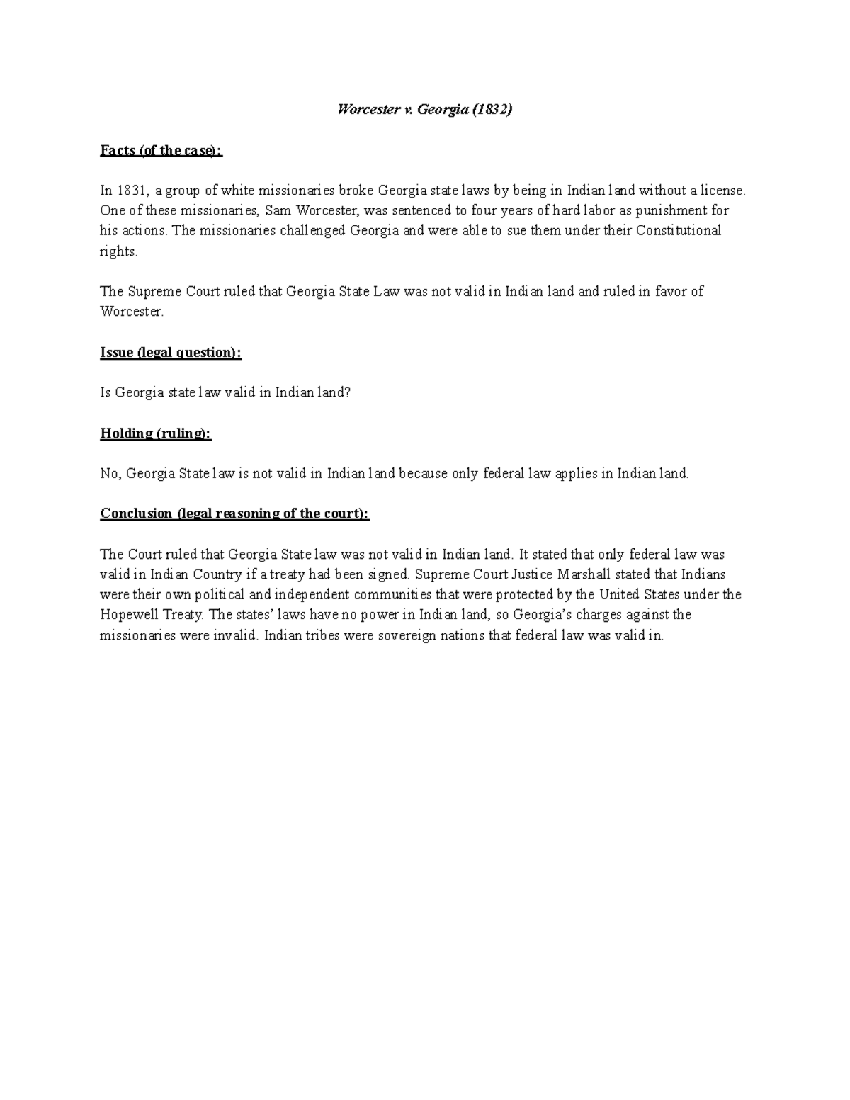 Summary The Worcester v Georgia case
