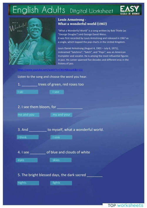 Louis Armstrong: What a Wonderful World ESL worksheet by tulka