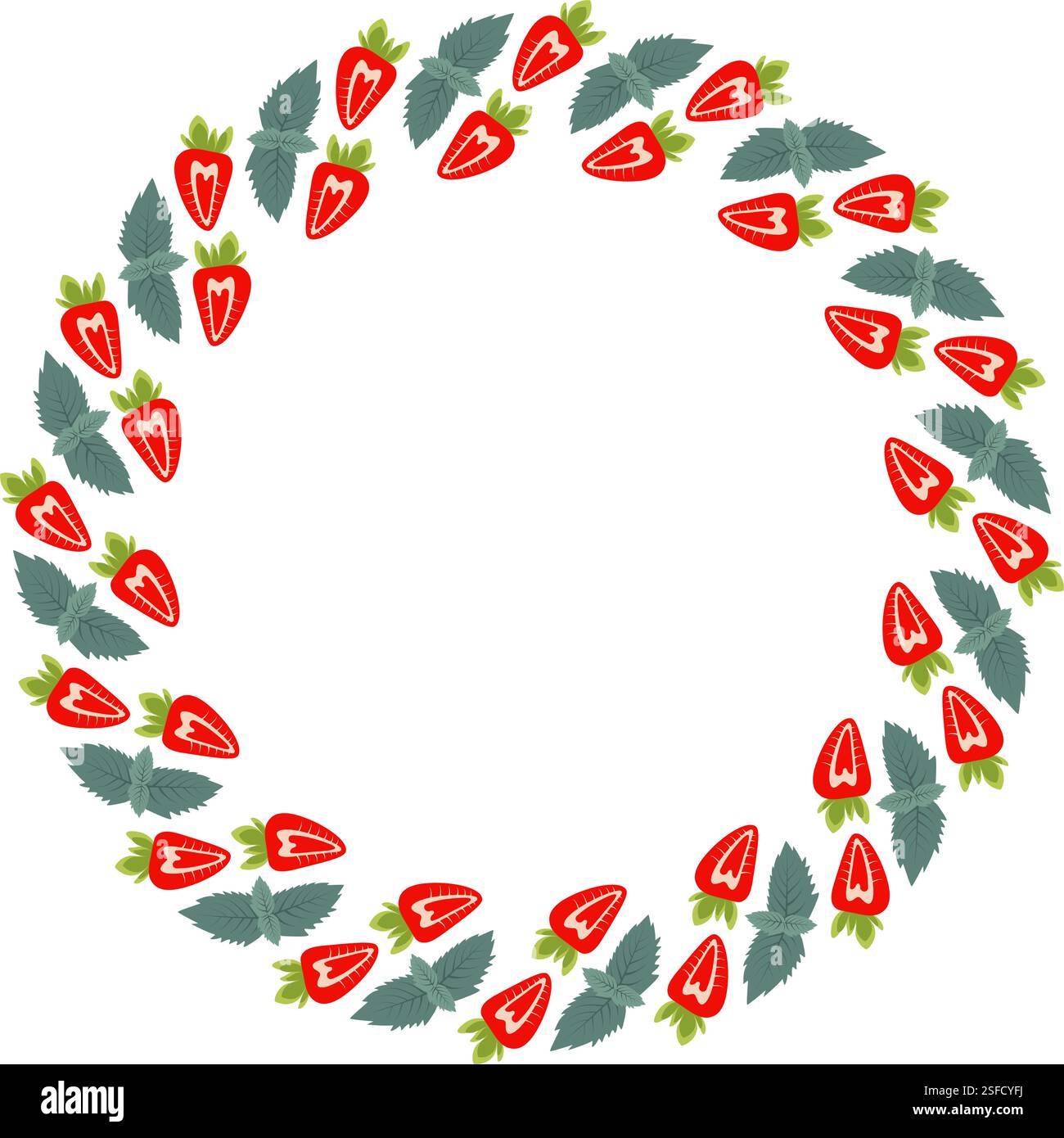 Half Strawberry and mint leaves Circular Frame Border Summertime fruit
