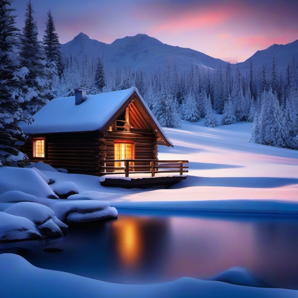 Serene Winter Evening at a Snow Covered Lakeside Cabin in the Mountains