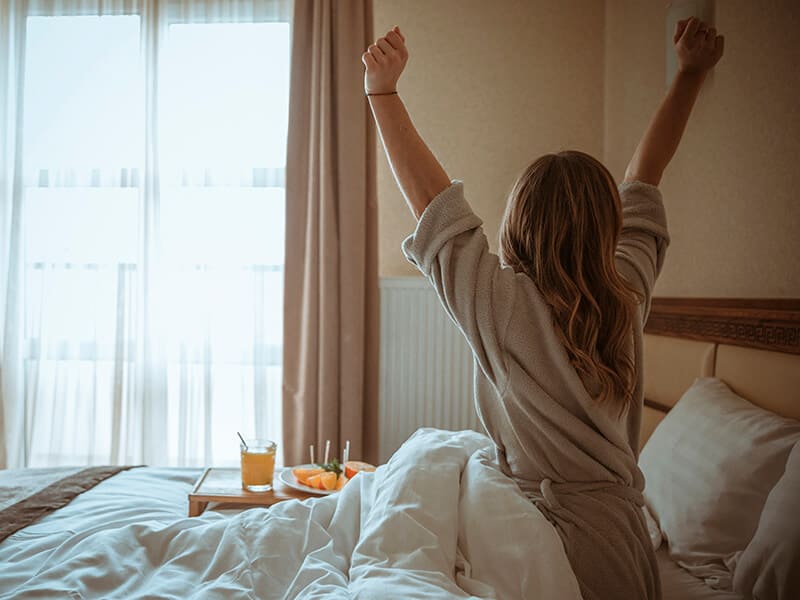 Young Woman Waking Up Happily after a Good Night Sleep Stock Photo