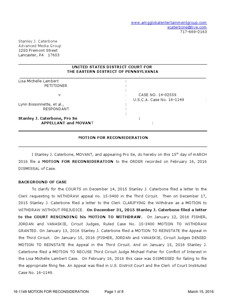 16 1149 U S Third Circuit Appeal MOTION to RECONSIDER Order of
