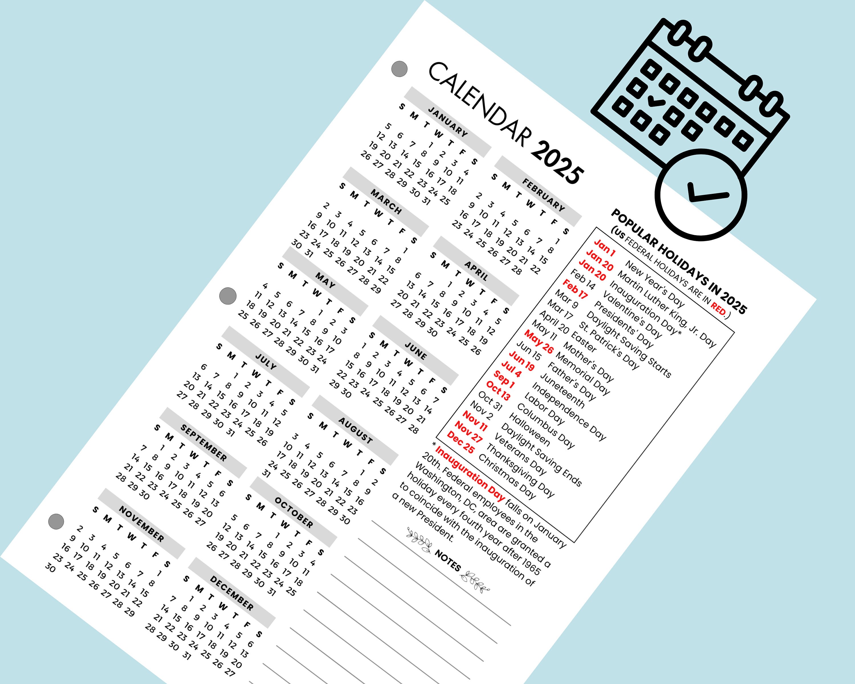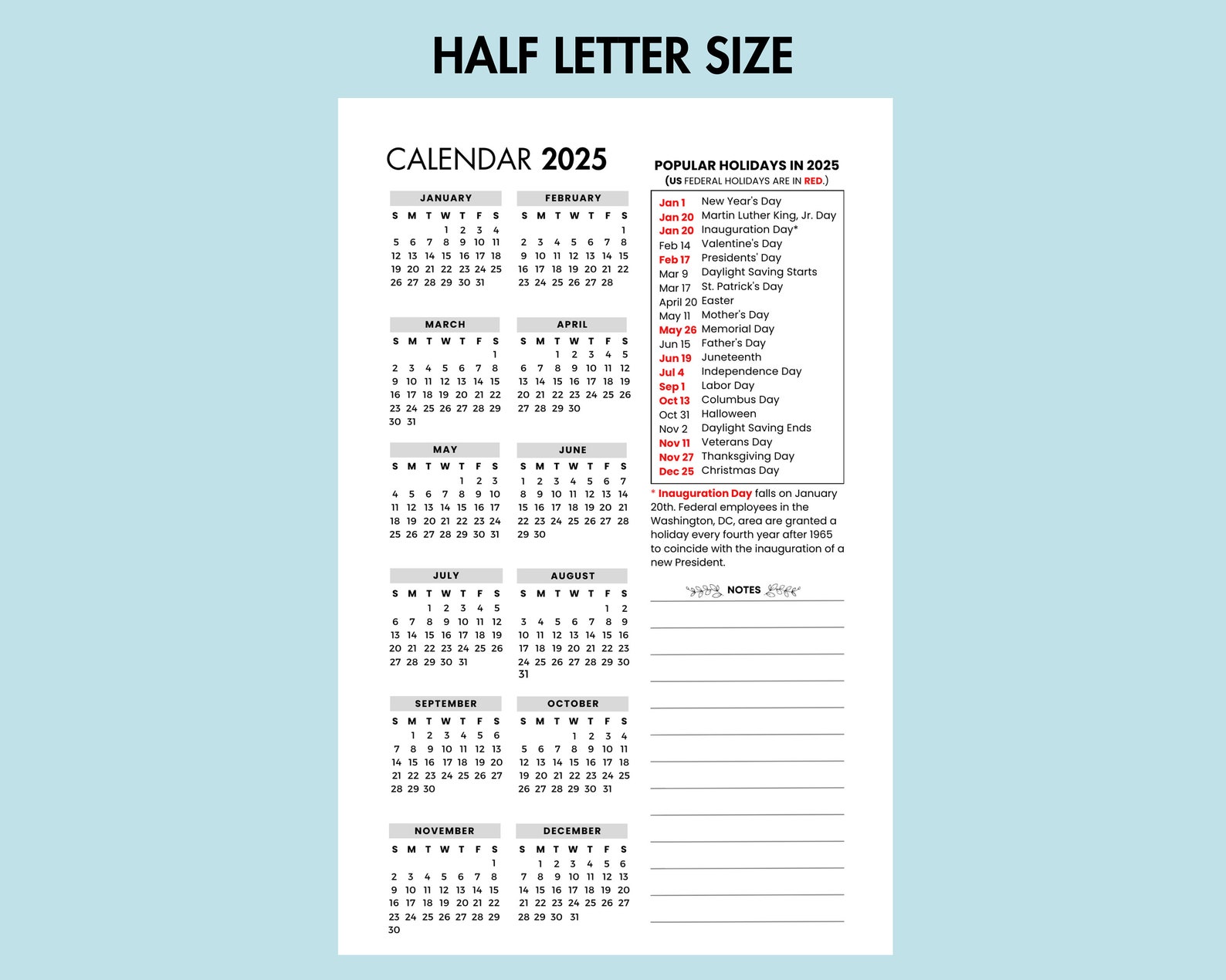 2025 Calendar with Federal Holidays