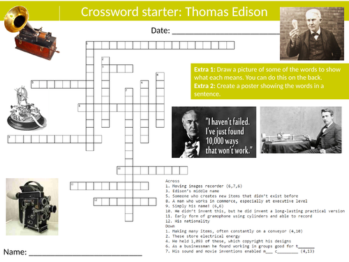 Thomas Edison Crossword Sheet Starter Activity Keywords Cover Famous