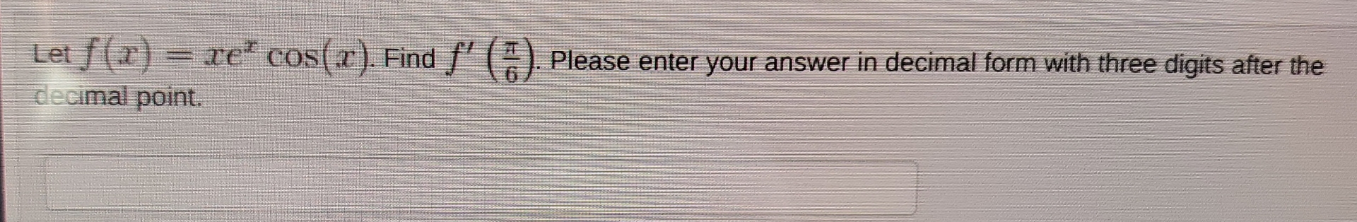 Solved Let f(x)=xexcos(x) Find f #39 (π6) Please enter your Chegg com