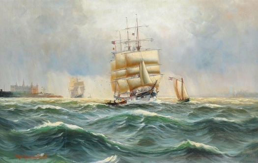 Solve Alfred Jensen Seascape with a three masted ship off Kronborg