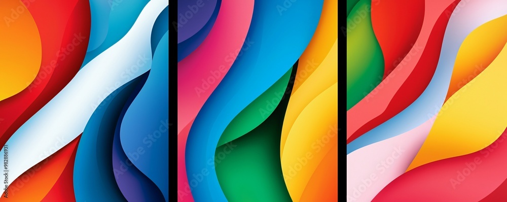Abstract geometric patterns with vibrant colors in a three panel
