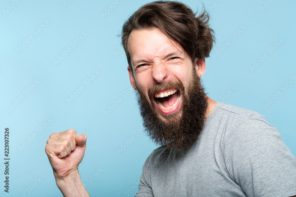 Portrait of thrilled man rejoicing and enjoying his aims with clenching