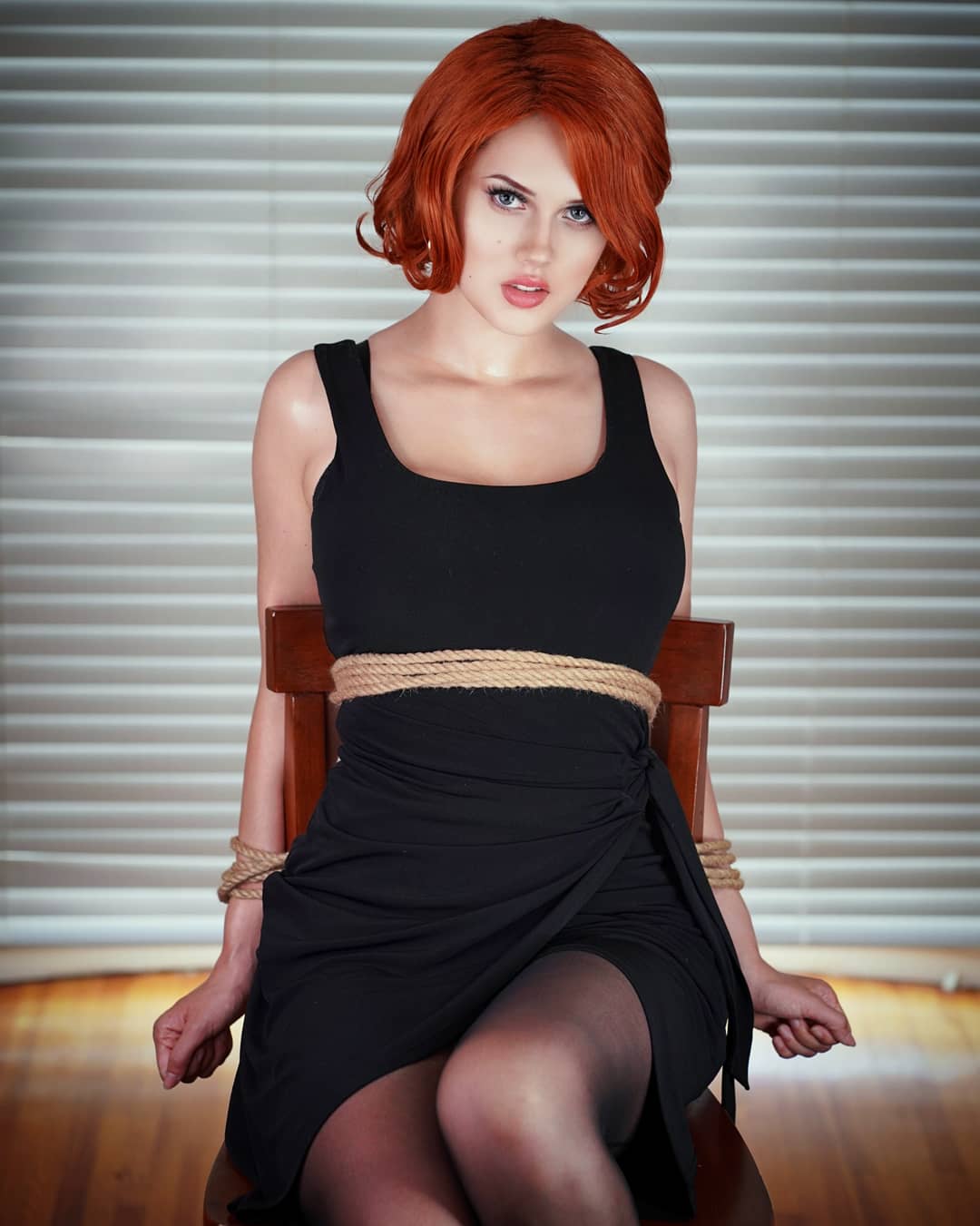Redheaded Woman in Black Dress with Lacey Stockings AI Image Generator
