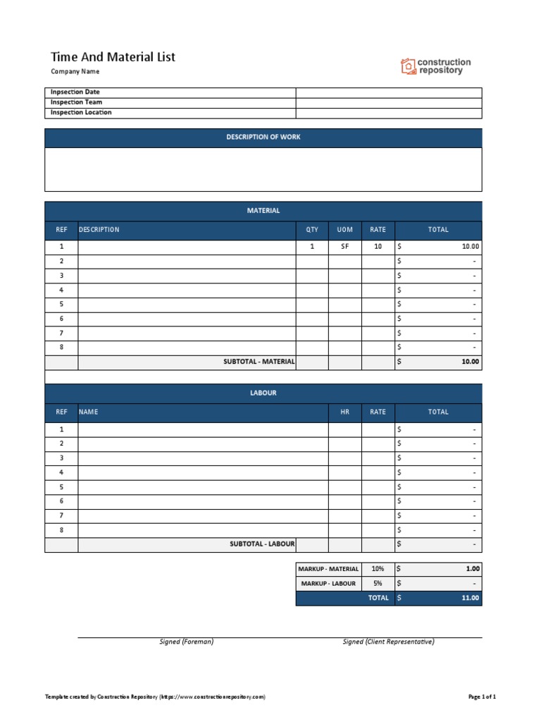 Printable Time And Material Template Printable Templates Free