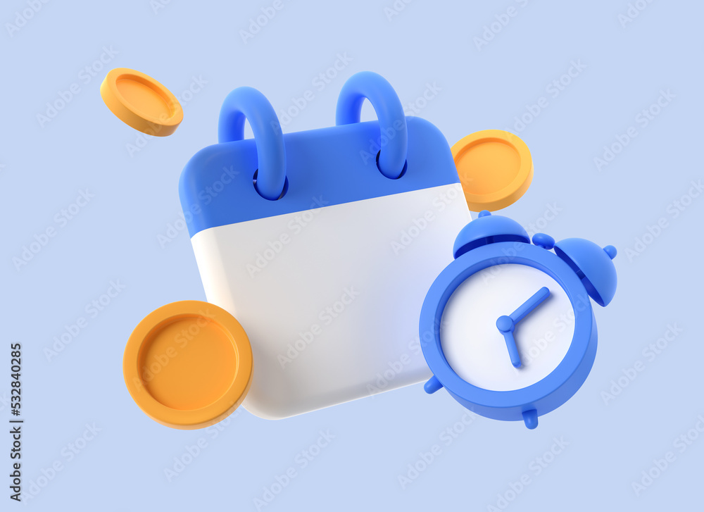 3d icon of a calendar and an alarm clock with gold coins in a cartoon