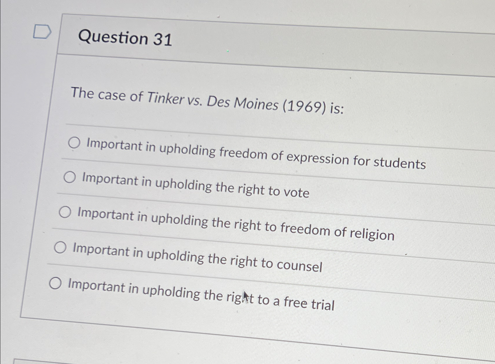 Solved Question 31The case of Tinker vs Des Moines (1969) Chegg com