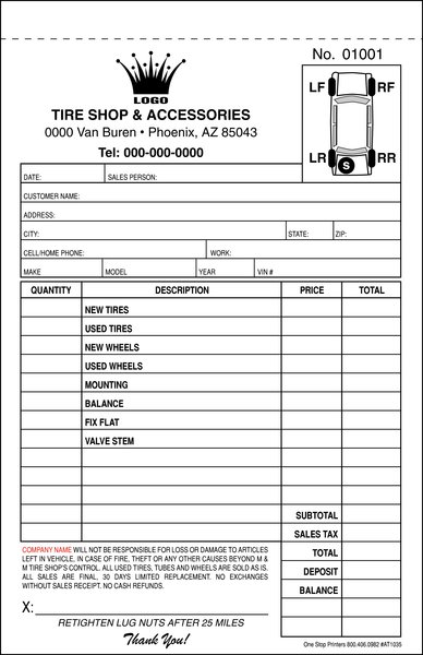 Tire Shop Invoice Form Sales or Repair Receipt Printing DesignsnPrint