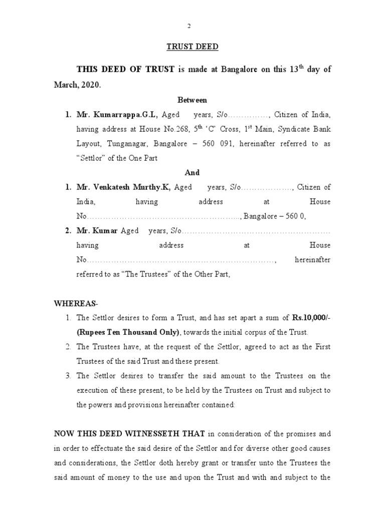 THIS DEED OF TRUST Is Made at Bangalore On This 13 Day of March 2020