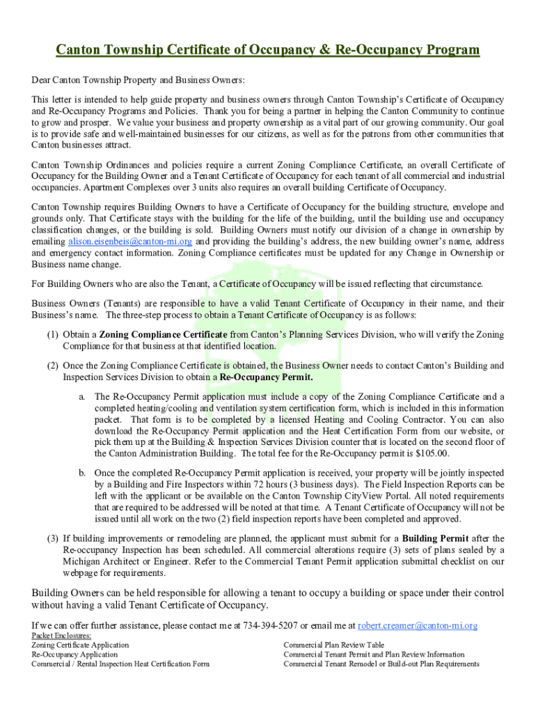 Fillable Online Canton Township Certificate of Occupancy Re Occupancy