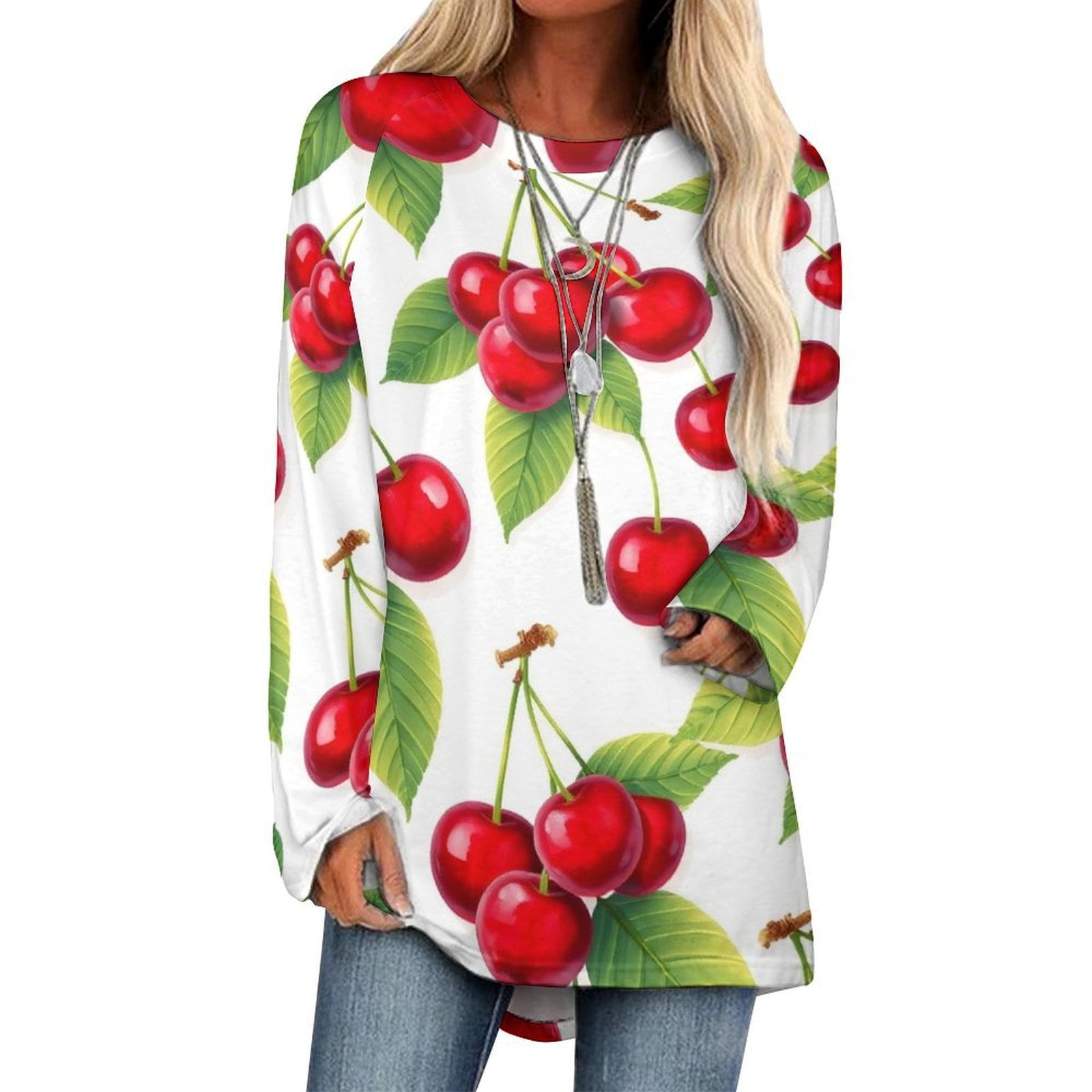 Casual Long Sleeve Crew Neck T Shirt Women #39 s Sweet Cherry Pattern