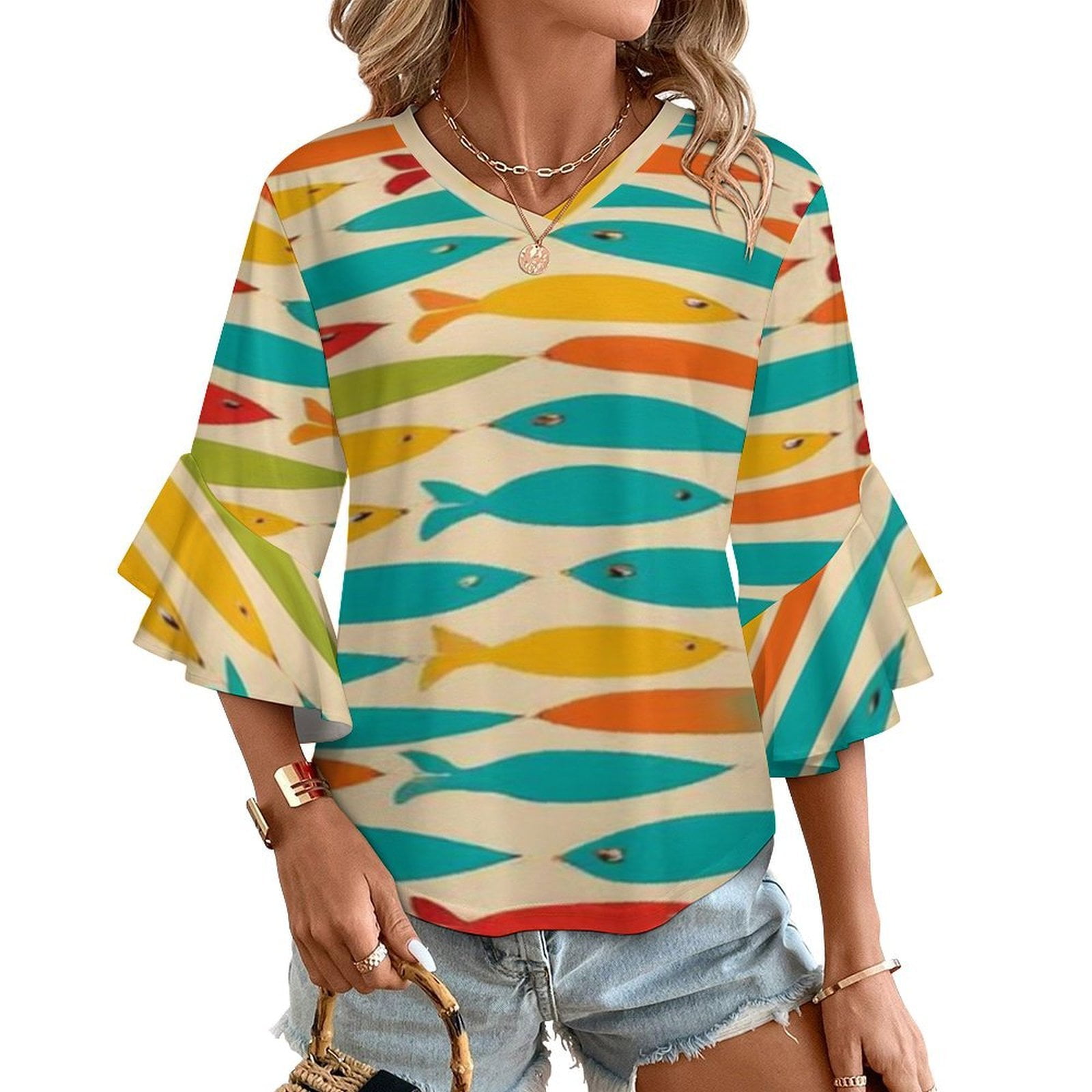 Colorful Fish Swim Art Print Women #39 s V Neck Blouse With 3/4 Ruffled