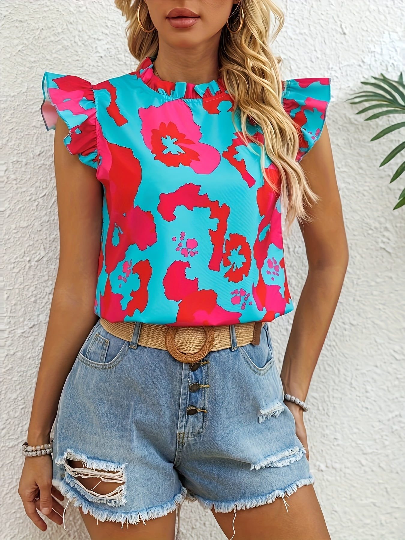 Floral Print Frill Neck Blouse Elegant Ruffle Sleeve Top For Spring