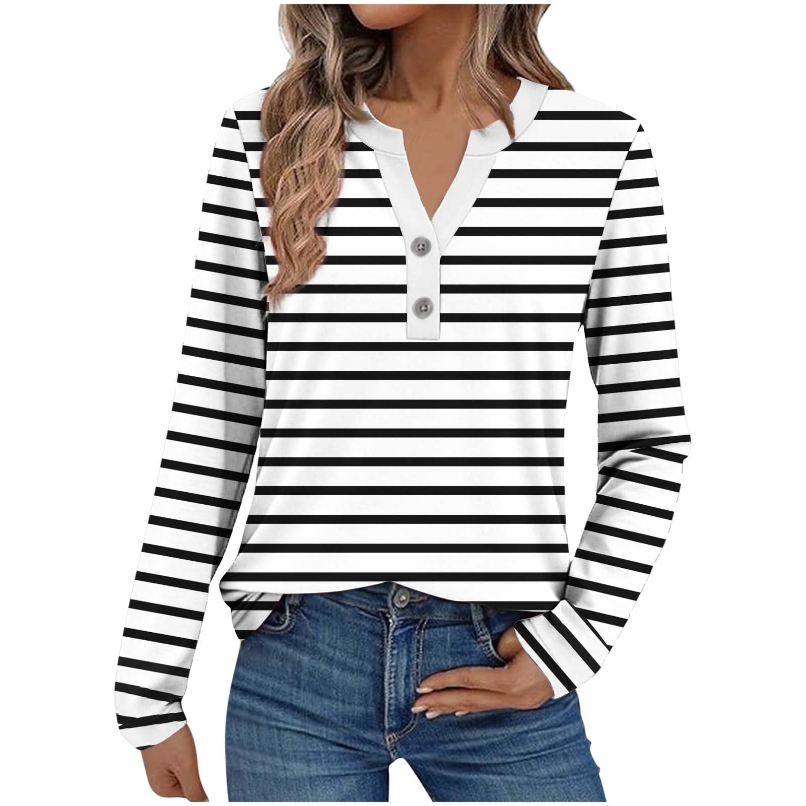 TFEOQRY Women #39 s Striped Print Top Color Block Long Sleeve Button V Neck