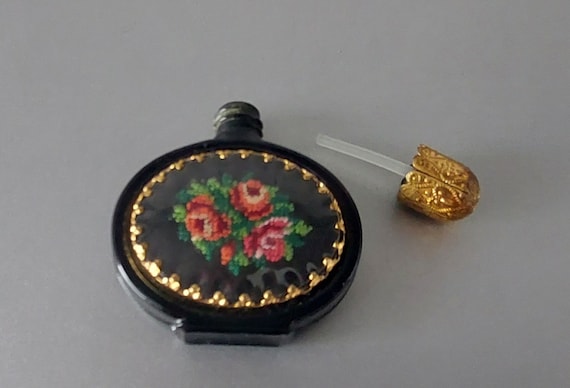 Vintage Petit Point Perfume Bottle 1950s Gold Filigree Rose Design