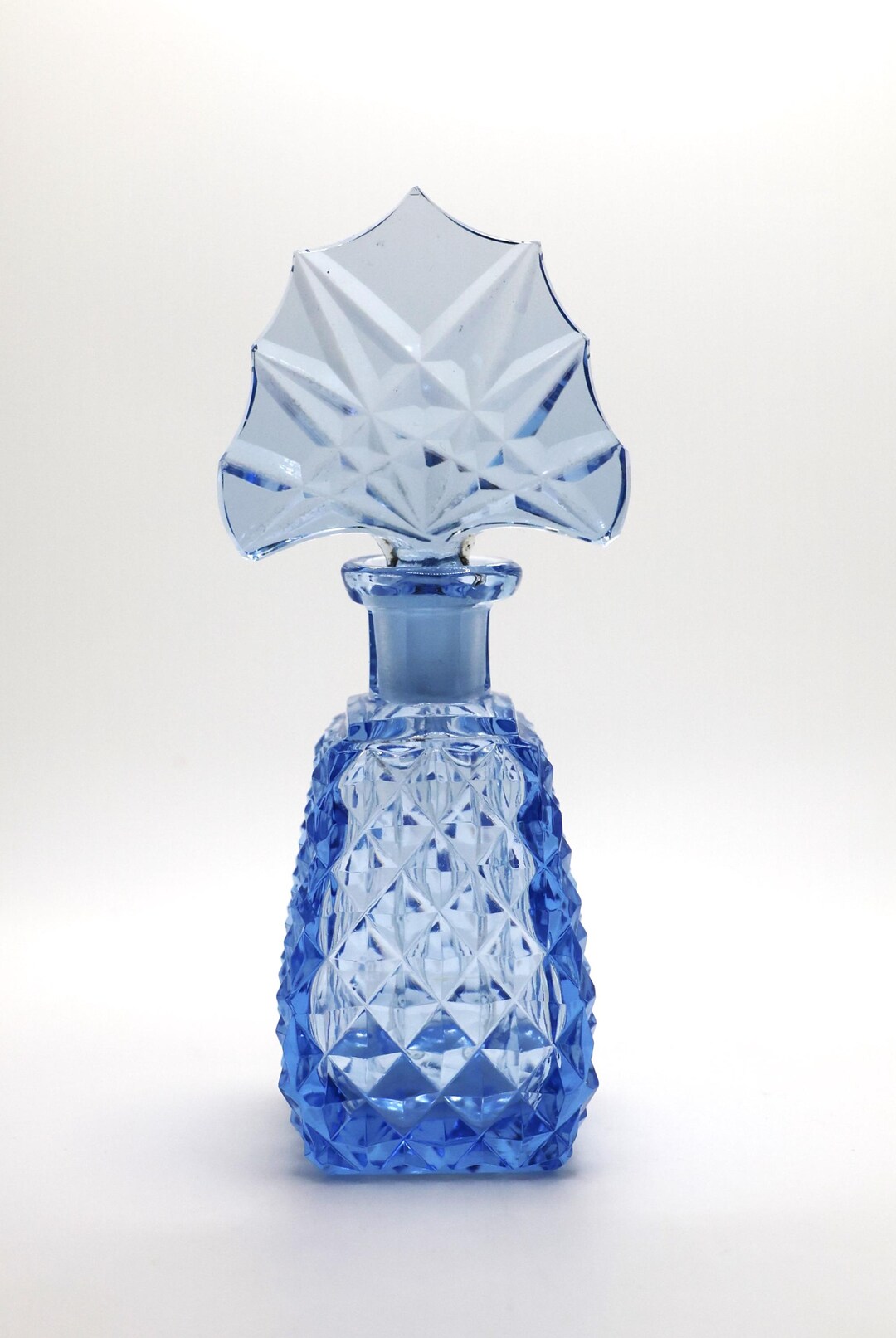 Rare Blue Cut Glass Diamond Point Perfume Bottle With Fan Shaped