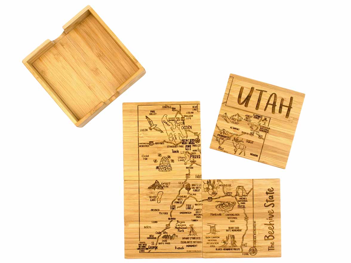 4 Piece Rhode Island Puzzle Coaster Set with Case Totally Bamboo