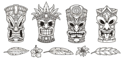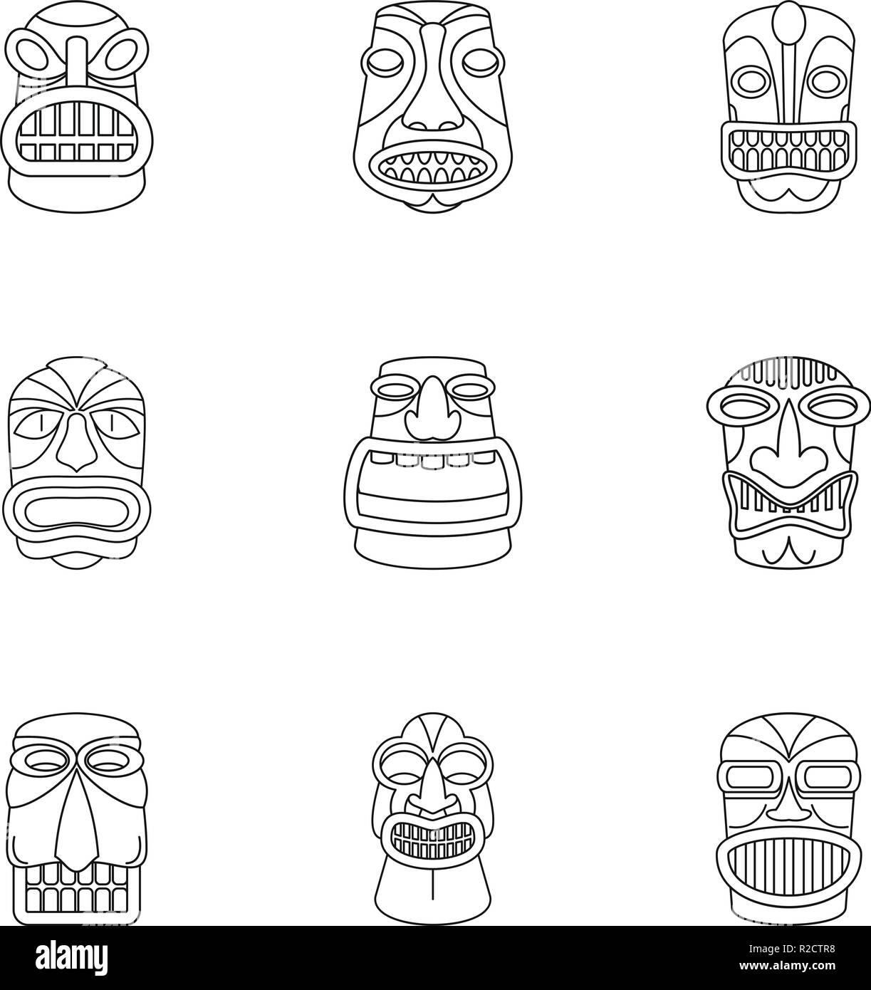 Tiki idol aztec hawaii face icons set Outline illustration of 16 tiki