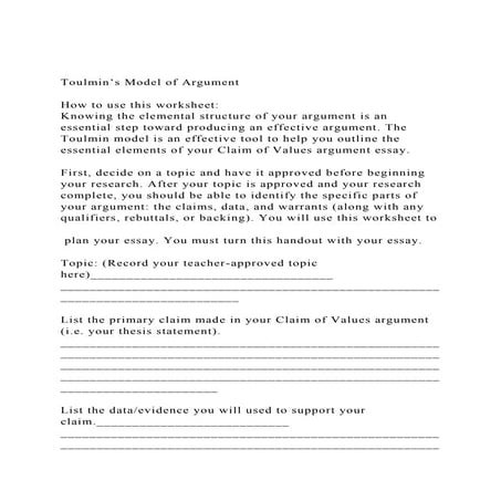 Toulmin Model Worksheet Toulmin s Model of Argument How to use this