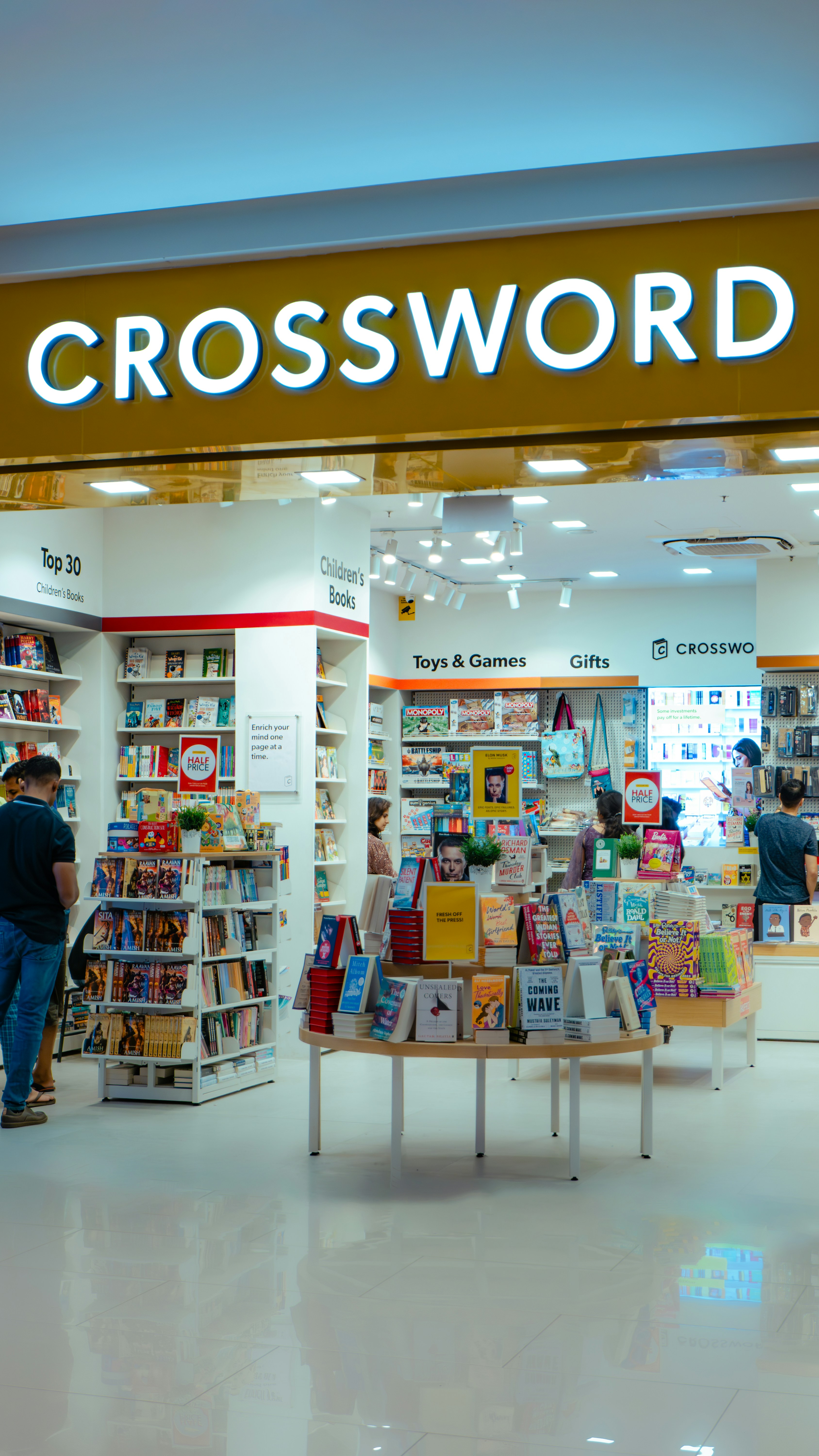 A crossword store with a man standing in front of it photo Free