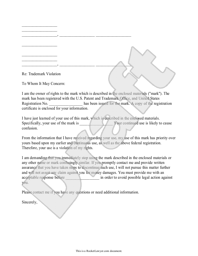 Free Trademark Violation Letter Template Rocket Lawyer