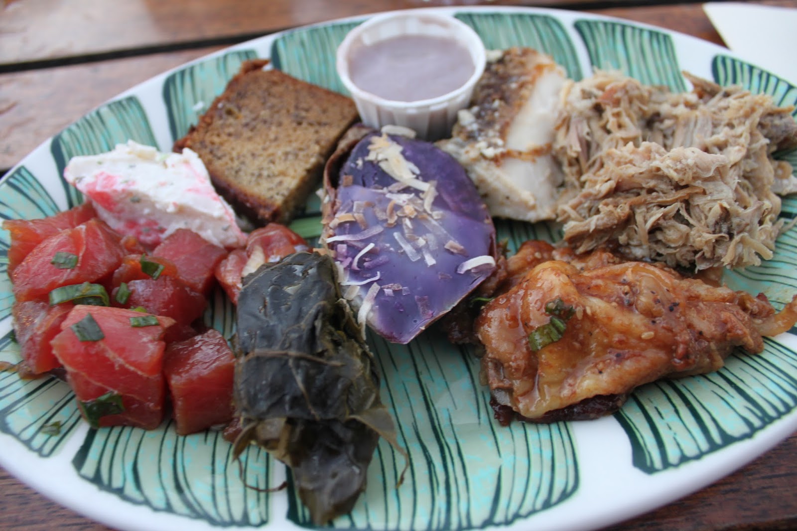 Traditional Luau feast spread with kalua pork laau pakoko fish loihi