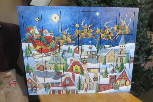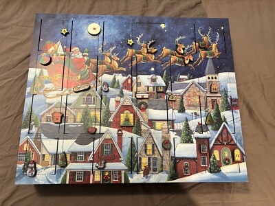 MIB BYERS CHOICE WOODEN ADVENT CALENDAR SANTA #39 S SLEIGH 24 DOORS HOLDS